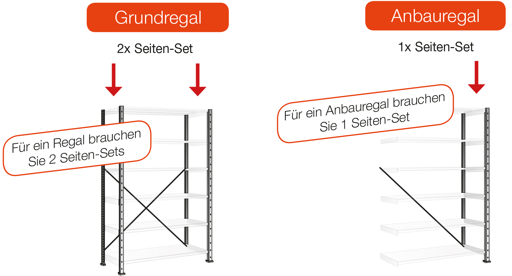 Für ein Regal (Grundregal) brauchen Sie 2x Seiten Sets. Für ein weiteres Regal, welches Sie an ein bestehendes Regal in gleicher Tiefe dran bauen (Anbauregal) brauchen Sie 1x Seiten-Set.